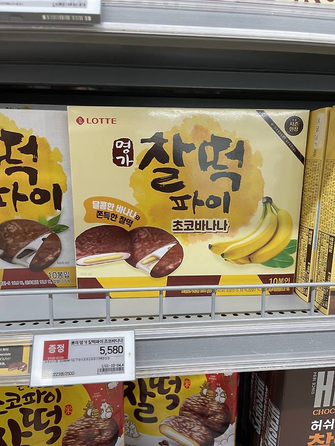롯데 명가 찰떡파이 초코바나나는 쫀득한 찹쌀떡에 초콜릿과 바나나 크림이 조화를 이루는 디저트로, 달콤하고 부드러운 맛이나요.