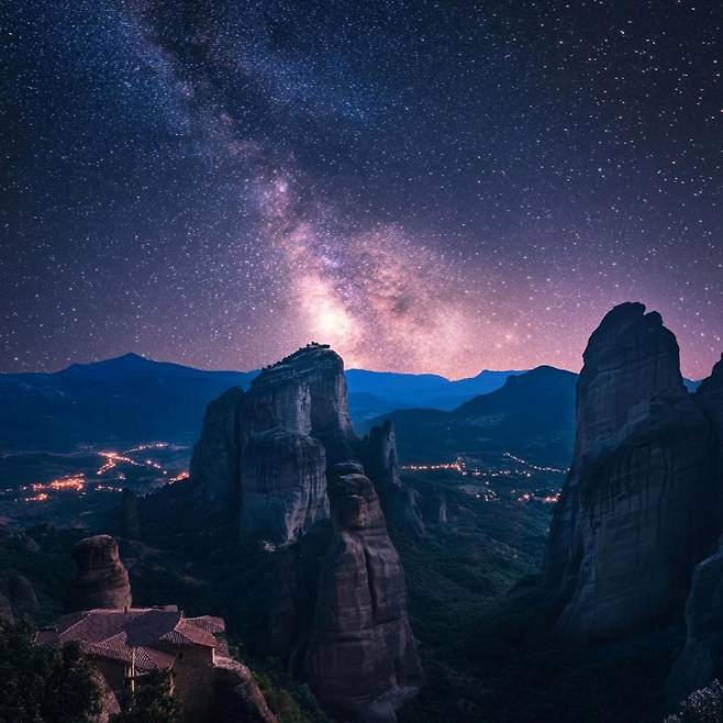 산토리니가 눈부신 해변의 로망이었다면, 중부의 메테오라는 말로 다 할 수 없는 경이로움을 선사하는 특별한 곳입니다. 공중에 떠 있다는 뜻의 이름처럼, 수직으로 솟구친 거대한 바위 기둥 위에 수도원들이 아슬아슬하게 자리 잡고 있습니다.
