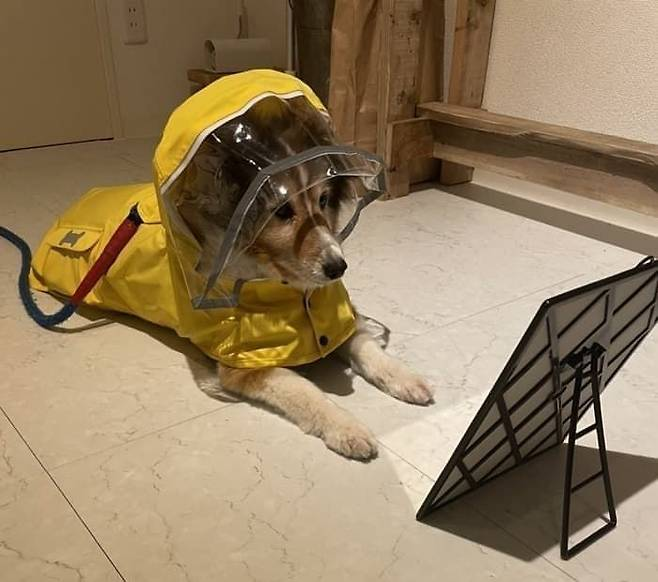 비 오는 날 산책을 위해 우비를 입힌 강아지가 거울 속 자신의 모습을 보고 산책을 포기하는 귀여운 에피소드가 화제가 되었습니다.