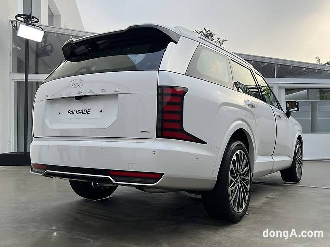 후면부 역시 수직형 테일램프와 입체적인 그래픽이 적용되어 차를 더 넓고 안정감 있게 보이게 한다. 테일게이트 중앙의 현대 엠블럼과 PALISADE 레터링이 브랜드 아이덴티티를 강조하며, 심플하면서도 고급스러운 마무리가 인상적이다.