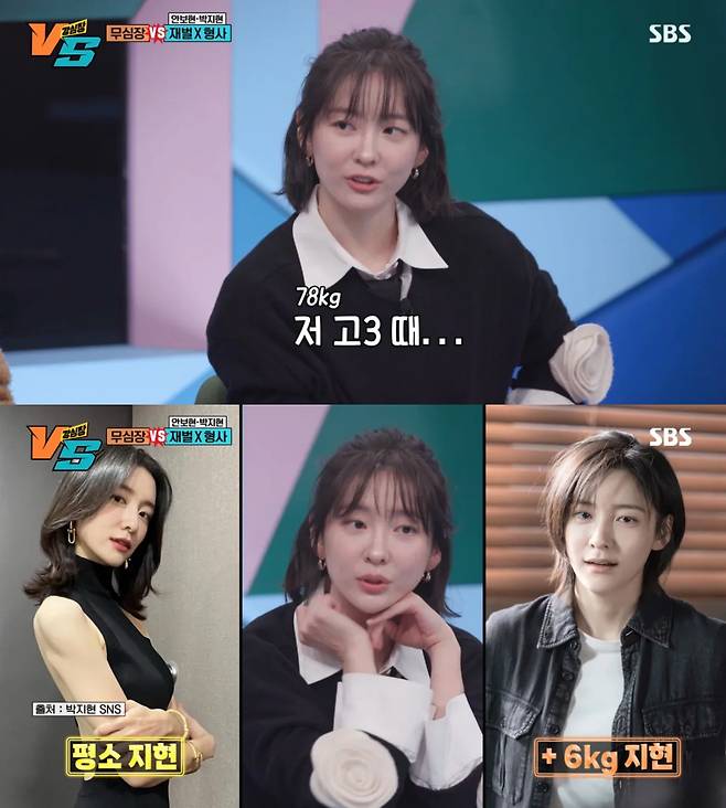 무엇보다 놀라운 것은 살이 쪄도 얼굴과 팔, 다리로는 가지 않아 78kg이었을 때도 그렇게 뚱뚱해 보이지 않았다는 것. 그렇다면 그 살들이 어디로 갔냐는 질문에 박지현은 "글래머"라는 말로 모두를 당황하게 만든다.