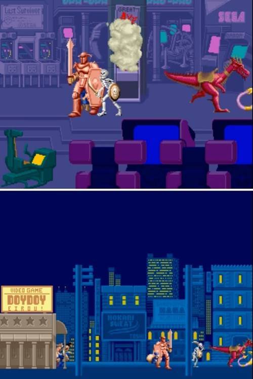 조기자: 저는 이 게임에 빼놓을 수 없는 것이 마법 병을 뱉어내는 파란색 꼬마 상인, 그리고 다양한 탈것들이라고 생각합니다. 꼬마 상인을 걷어차서 마법 물병을 빼앗는 설정은 당시에도 참 흥미로웠구요, 또 게임을 진행하면서 용이나 특이한 생명체에 타서 적들을 유린할 수 있어서 좋았죠.