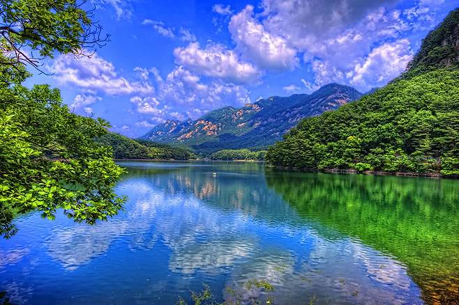 산정호수는 웅장한 산에 둘러싸인 맑은 호수로 날이 좋을 때 방문하면 하늘과 구름, 산을 그대로 투영시켜 절경을 이루는 명소입니다.