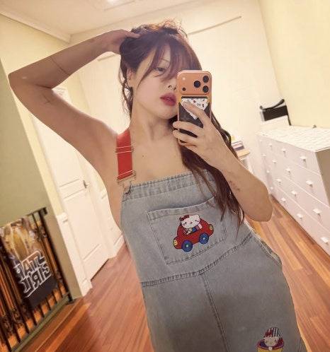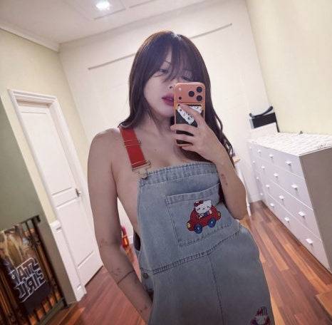 현아는 키티가 그려져 있는 귀여운 오버롤을