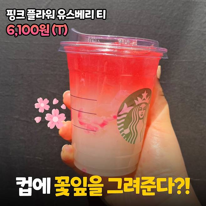 두 번째는 만개한 벚꽃을 연상시키는 비주얼의 신메뉴에요! 자세히 보면 컵에 분홍색 꽃잎이 그려져 있는데, 이런 디테일이 정말 기분을 좋게 하는 것 같아요!