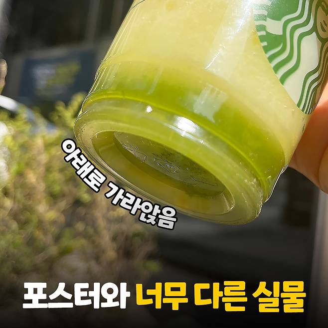 바질 레몬 셔벗 블렌디드는 메뉴가 나온 뒤 10초 정도만 포스터와 비슷한 비주얼을 유지할 수 있어요. 포스터에서 보이는 진한 녹색이 샤베트보다 밀도가 작은 '액체 상태'이기 때문!