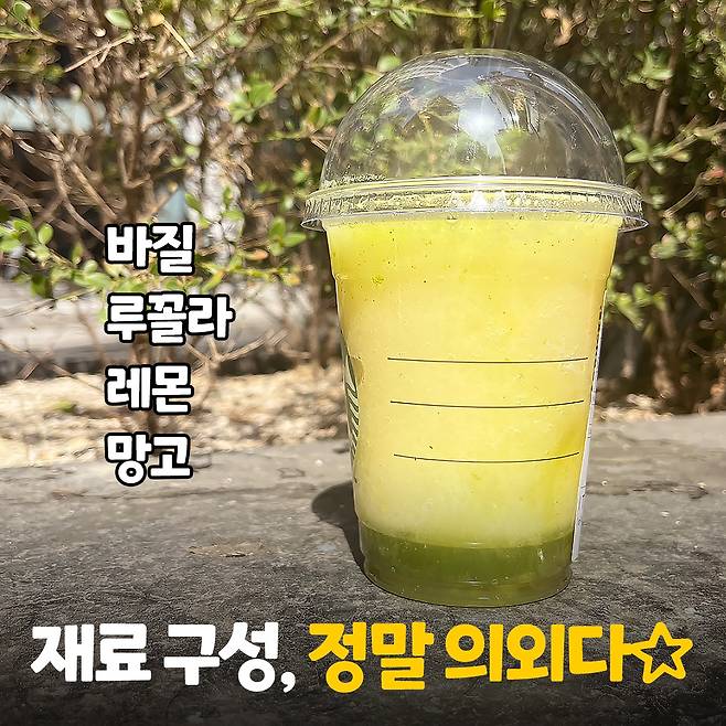 바질에 루꼴라까지 들어있다고 해서 으잉? 싶었는데 의외로 상큼한 맛과 잘 어울리더라고요? 망고와 레몬 향이 반반씩 느껴졌고 그 사이를 뚫고 느껴지는 바질 향이 의외로 너무 좋았어요!