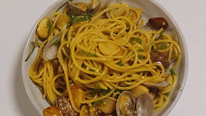 육수를 머금은 면과 쫄깃한 바지락 살이 맛있는 봉골레 파스타 완성이에요