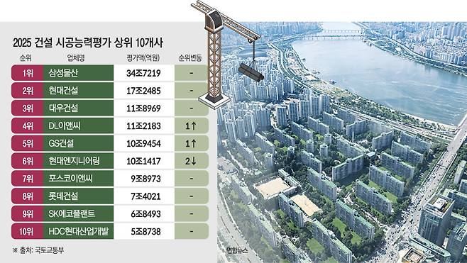 국토교통부는 31일 전국 8만7131개 건설업체 중 평가를 신청한 7만3657개사(84.5%)를 대상으로 실시한 ‘2025년도 시공능력평가’ 결과를 발표했다. 시공능력평가는 발주자가 적정 시공업체를 선정할 수 있도록 공사실적, 경영상태, 기술능력, 신인도 등 4개 항목을 종합 평가해 매년 공시된다.