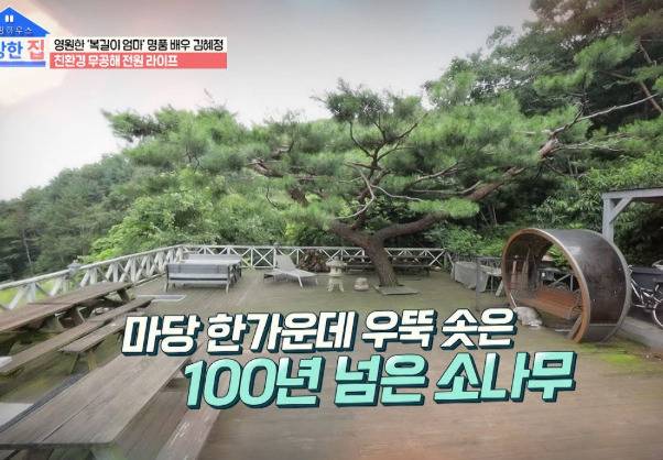 김혜정이 거주하고 있는 저택에는 특별한 존재가 함께하고 있다. 바로 수령 200년이 넘은 소나무다. 이 소나무는 집만큼이나 오랜 세월을 견뎌낸 존재로, 김혜정에게는 일종의 버팀목 같은 존재다. 그녀는 소나무를 바라보며 매일 아침을 시작한다고 말한다. 변화무쌍한 연예계 생활과는 달리, 소나무처럼 묵묵히 한자리를 지키는 삶을 선택한 김혜정. 이 오래된 나무는 그녀의 새 삶을 상징하는 존재가 되어주고 있다. 도시의 소음 대신 바람에 흔들리는 소나무 소리를 들으며 하루를 보내는 그녀의 일상은 겉으로 보기에 단조롭지만, 누구보다 충만한 삶일지도 모른다.