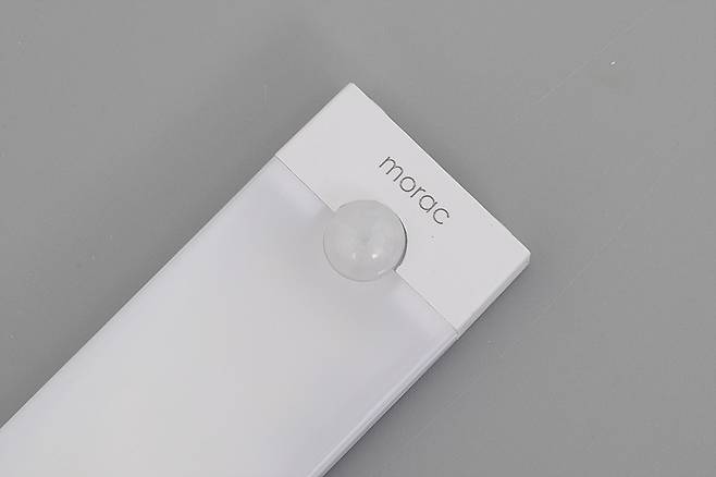 윗면 한쪽 끝에는 모락 브랜드 로고와 함께 반구형 흰색 부품이 돌출되어 있는데, 움직임을 감지하는 모션 감지 센서가 들어 있는 곳이다.