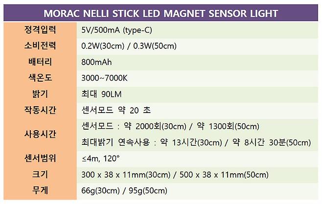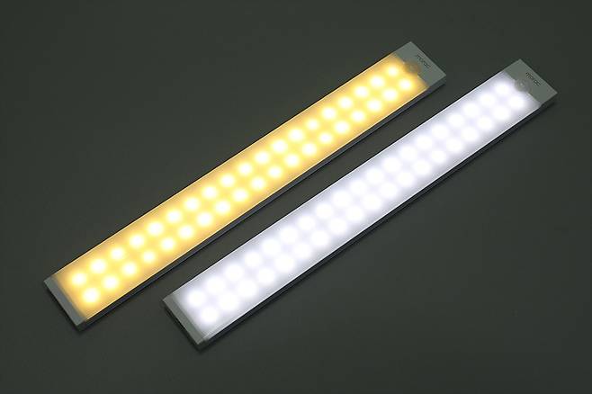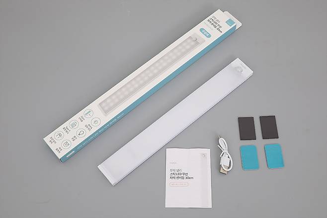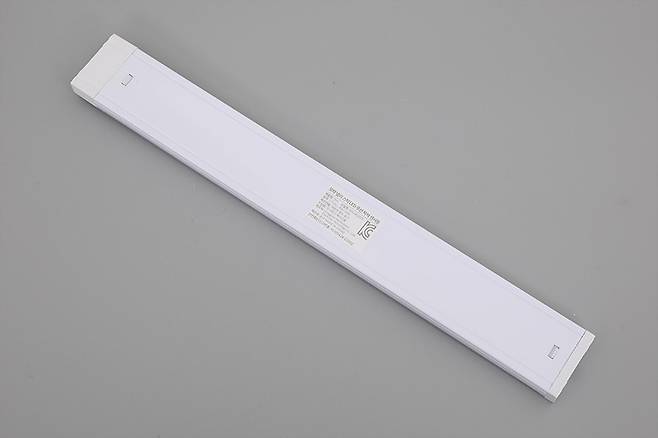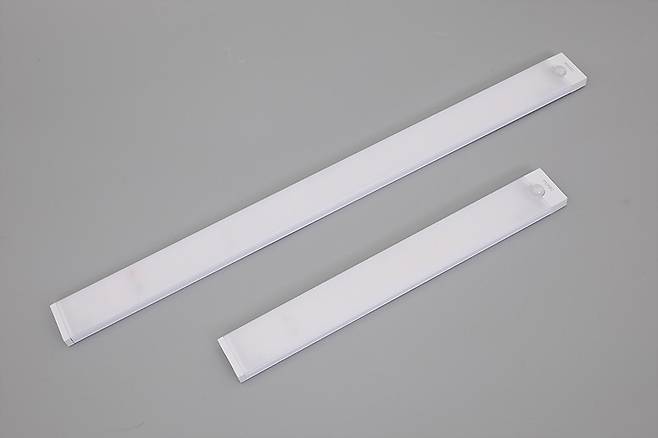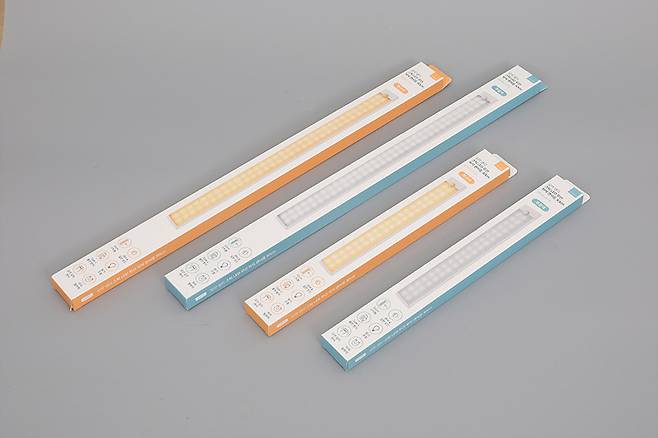 모락 넬리 스틱 LED 무선 센서등은 길다란 박스에 담겨 있다. 길이는 50㎝와 30㎝ 두 가지이며, 색상도 주광색과 전구색 두 가지로 나뉘어 있다. 박스 앞면에 제품의 외형과 색상까지 모두 인쇄되어 있기 때문에 박스만으로도 구분이 가능하다.