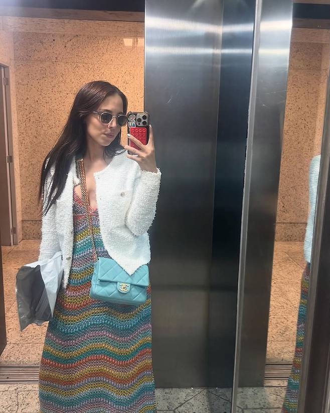 그녀는 그레이 컬러의 미디 드레스 위에 연핑크 컬러의 니트 가디건을 레이어링해 사랑스러우면서도 단정한 인상을 남겼다. 드레스 전면에는 잔잔한 펄 디테일이 흩뿌려져 있어 조명에 따라 은은한 반짝임을 더하며, 가디건 또한 진주 장식이 돋보이는 디자인으로 통일감을 준다. 두 아이템 모두 부드러운 실루엣과 촉감을 자랑해 여름철 실내외를 오가며 착용하기 좋은 구성이다.