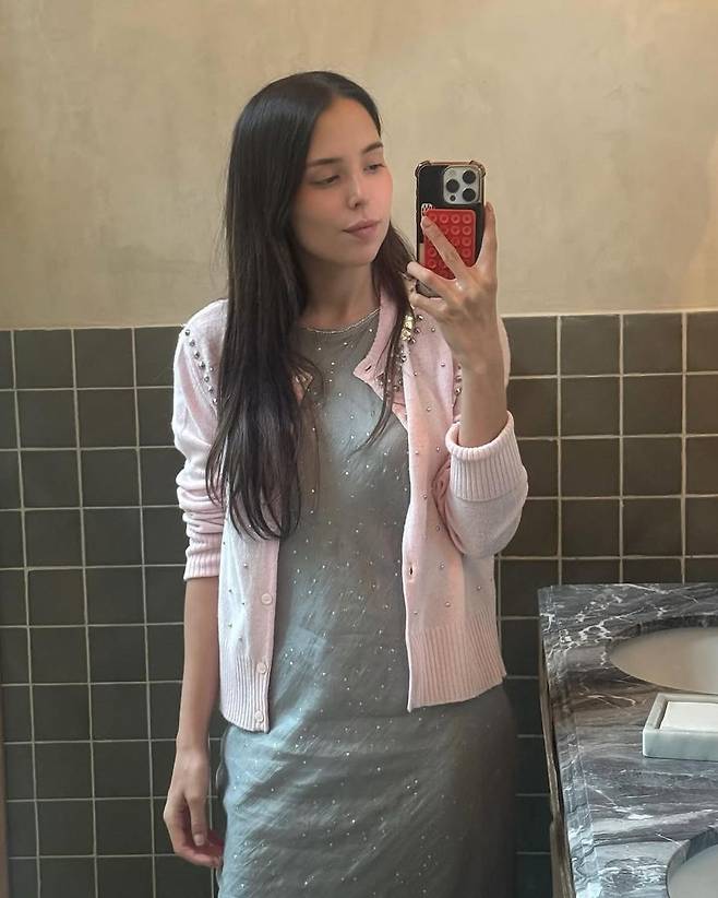 비슷한 무드를 연출하고 싶다면, 뉴트럴한 컬러의 미디 원피스를 기본으로 삼고, 톤온톤 또는 톤인톤 계열의 니트 가디건을 가볍게 걸쳐보는 것을 추천한다. 여기에 진주나 스팽글 등 은은한 광택이 있는 디테일을 더하면, 마호 아길라르처럼 단정하면서도 특별한 데일리룩을 완성할 수 있다.