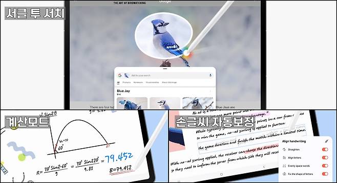 아이패드 11세대에 비해 갤럭시탭 S10 FE는 ‘갤럭시 AI’ 기능을 활용할 수 있다. 모든 기능을 사용할 수는 없지만 실사용자들이 많이 사용하는 서클 투 서치와 AI 지우개, 계산모드는 쓸 수 있다.