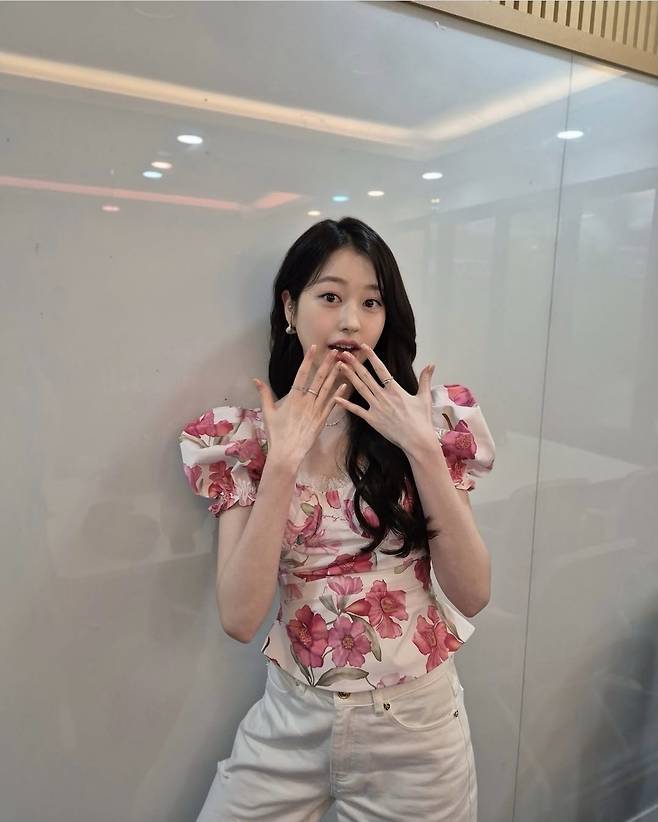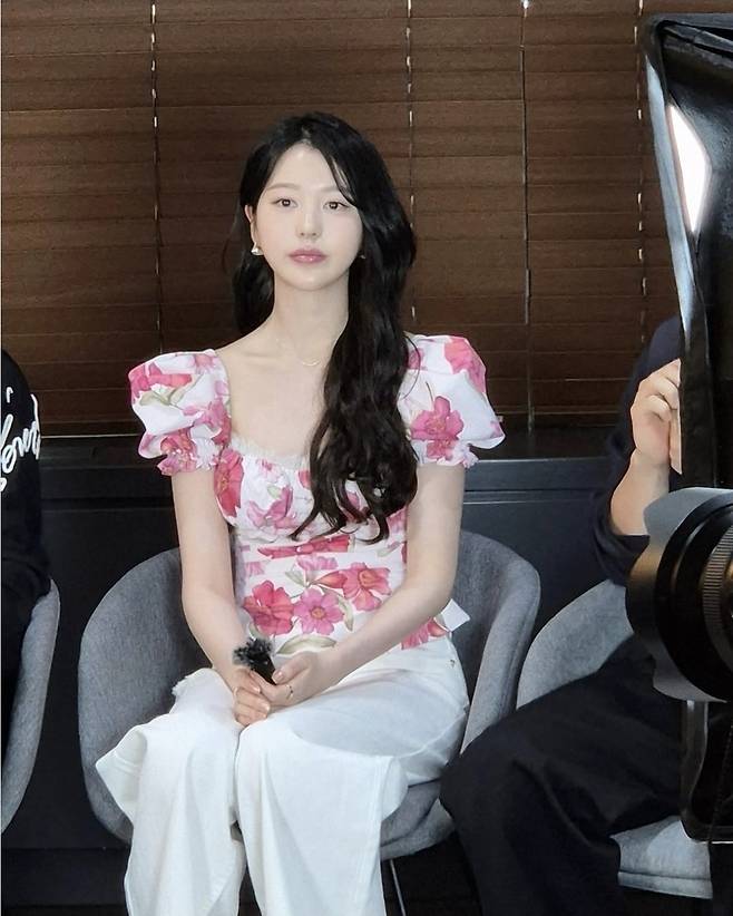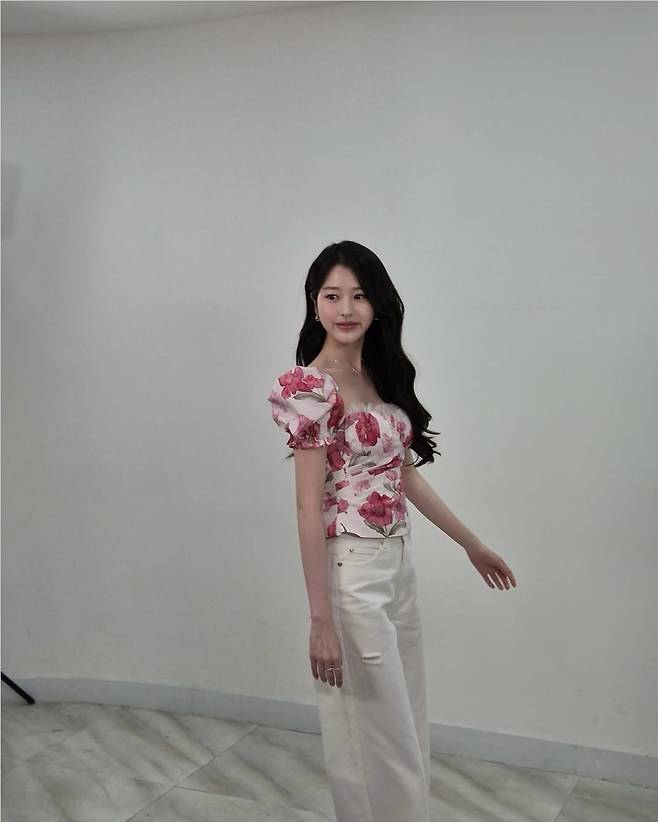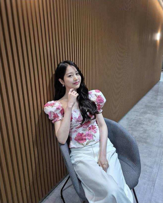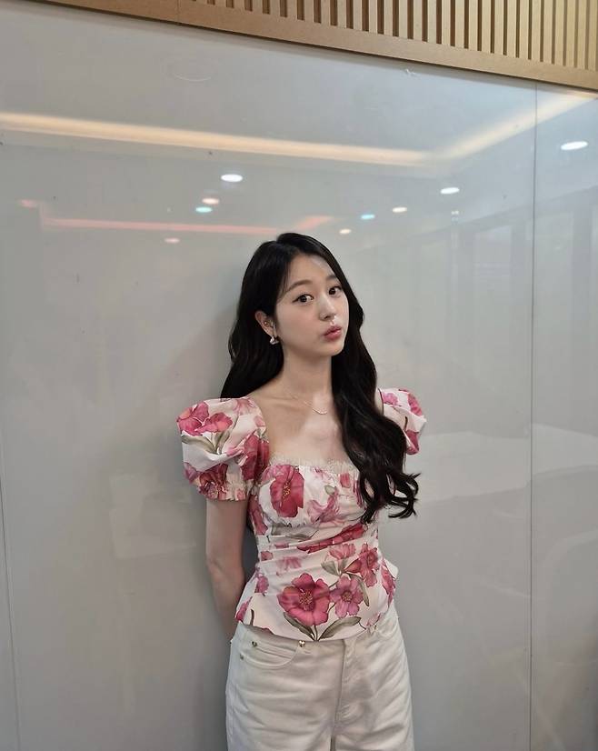 장다아는 풍성한 핑크 플라워 패턴의 반팔 블라우스에 아이보리 와이드 팬츠를 매치해 단아하면서도 생기 넘치는 룩을 완성했습니다.