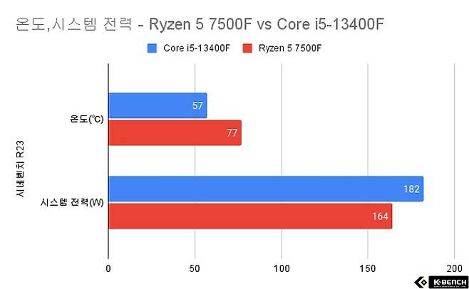 결과는 시네벤치R23 동작중 살펴본 결과이며, 온도는 코어 i5-13400F가 좀더 낮게 나오며, 반대로 전력 소비율은 라이젠 5 7500F가 더 낮게 나오는 모습을 볼 수 있었다.