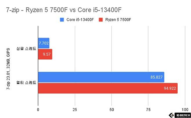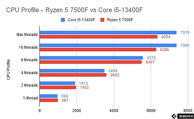 케이벤치에서 라이젠 5 7600과 코어 i5-13400을 비교하는 지난 기사에서도 언급했었지만, 단순 총 코어 갯수가 많다고 해서 무조건 좋은 것은 아니며, 클럭적인 부분에서 AMD가 우수한 편이기 때문에 각종 테스트에서 우위가 분명 다를 것이다.