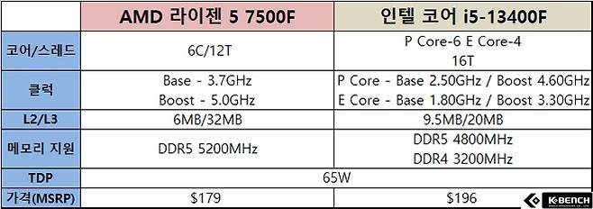 이번 라이젠 5 7500F는 인텔의 코어 i5-13400F과 가장 비슷한 등급에 위치하고 있다고 보이는데, 이 두 CPU를 비교하며 테스트를 진행해 볼까 한다.
