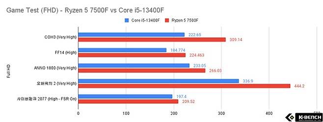 이어서 게임 테스트는 간단하게 진행 해보았으며, 게임 테스트에서는 대부분 모두 라이젠 5 7500F가 앞서는 결과를 보여주었다.