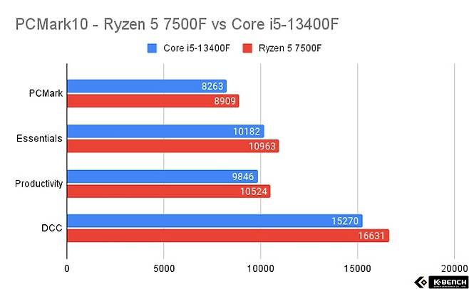PCMark10의 경우, 전체적인 평가가 라이젠 5 7500F의 손을 들어주는 모습을 볼 수 있었다.