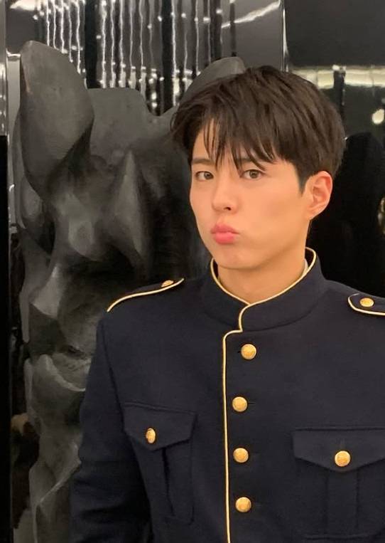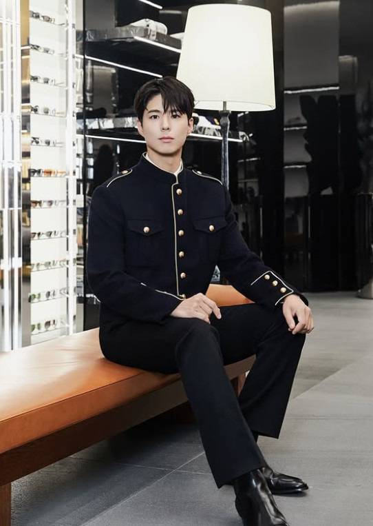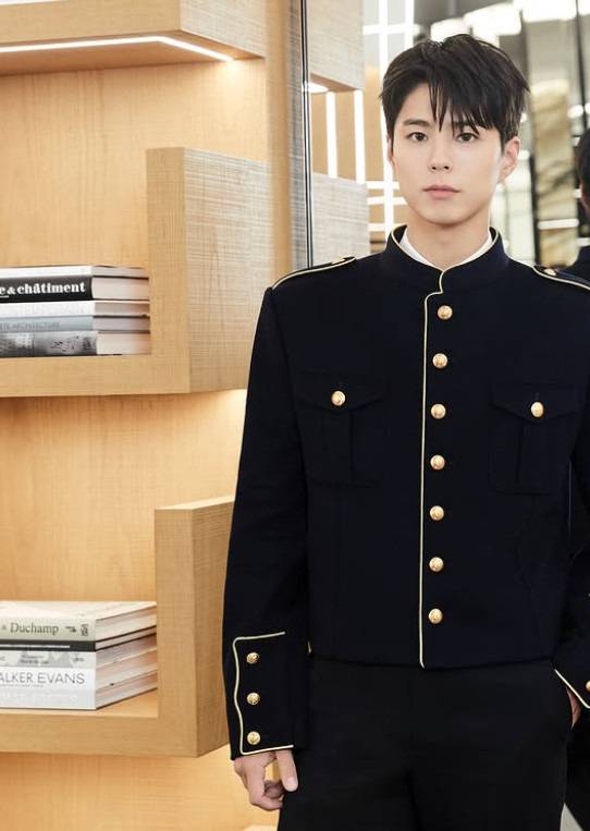 이날 박보검은 다크 네이비와 골드 조합의 클래식 밀리터리 스타일 재킷과 블랙 팬츠를 착용해 우아한 모던한 스타일을 완성했어요.