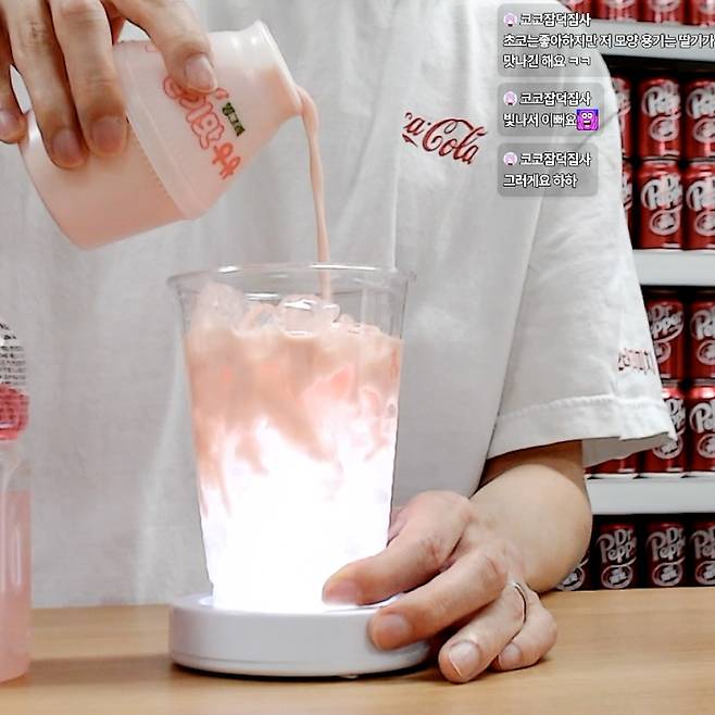 바나나맛 우유만큼이나 많이 사는 것은 옆자리에 위치한 분홍색 '딸기맛 우유'다. 이 녀석과 아이들이 좋아하는 '모구모구 리치맛'을 함께 섞어보았다. 아이스컵에 모구모구를 먼저 넣고(편의점 믹솔로지 세게에는 계량 같은 게 없지만 일반적으로 색이 진하지 않은 것을 먼저 넣는다). 그 위에 딸기맛 우유를 부어준다.