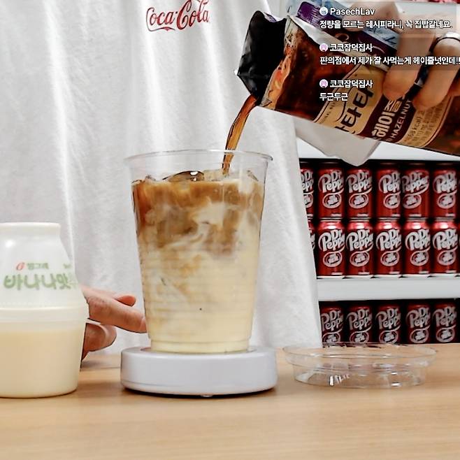 외국인들이 가장 많이 해 먹는 조합이다. '바나나맛 우유(a.k.a 뚱바)'를 하나 사고, 얼음컵에 반절 붓는다. 그리고 나머지를 파우치형 커피인 '칸타타 헤이즐넛향 파우치'로 채우면 완성이다. 제법 그럴듯한 카페음료 같은 색 조합을 볼 수 있다.