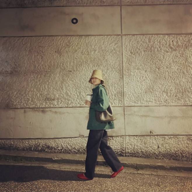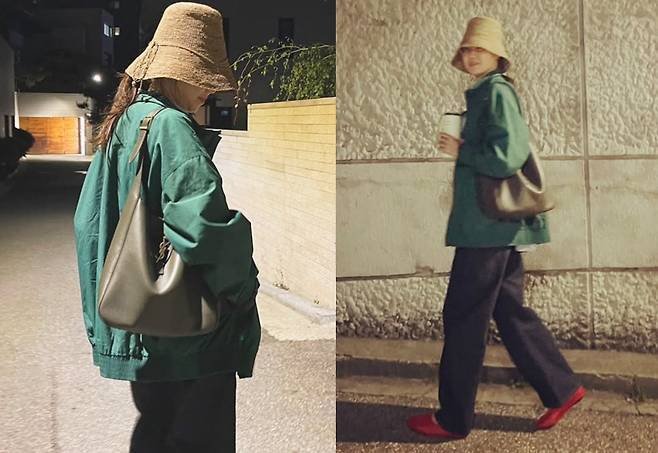 공효진은 넉넉한 핏의 그린 윈드브레이커에 다크 데님 팬츠를 매치한 기본적인 조합 위에, 스트로 버킷햇과 레드 컬러의 플랫 슈즈로 감각적인 포인트를 주었습니다.