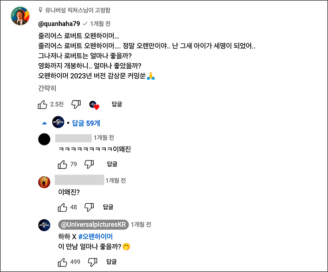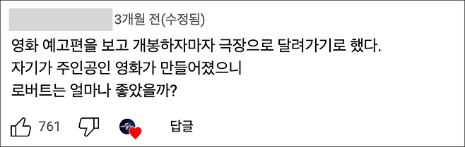 이미지 = 유튜브 채널 “유니버설 픽쳐스” 영상 댓글 캡쳐(https://youtu.be/oSqK_v6zPoM)