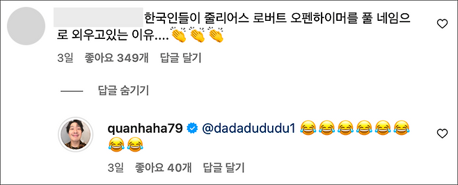 이미지 = 하하 인스타그램 계정 @quanhaha79 댓글 캡쳐(https://www.instagram.com/p/Cv3rRbKL4rV/?utm_source=ig_web_copy_link&igshid=MzRlODBiNWFlZA==)