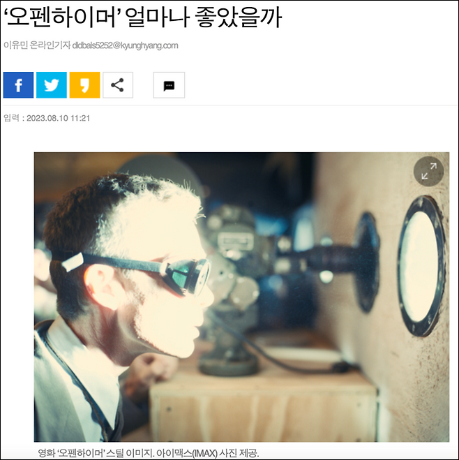이미지 = 이유민, "’오펜하이머’ 얼마나 좋았을까," 「스포츠경향」, 2023년 8월 10일, (https://sports.khan.co.kr/entertainment/sk_index.html?art_id=202308101121003&sec_id=540401&pt=nv)