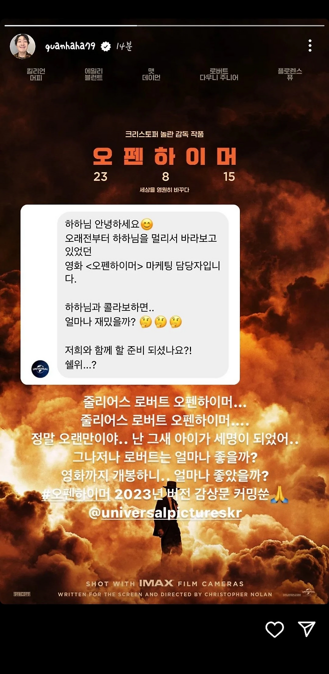영화 <오펜하이머>가 하하와 2023년 버전 감상문으로 콜라보 마케팅까지 하면서 세계관 완성이 되었다. 가슴이 웅장해지는 만남이다…