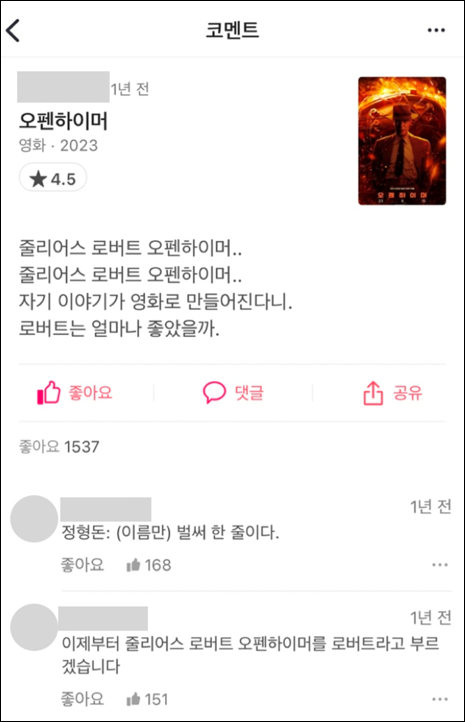 왓챠피디아에도 <오펜하이머> 감상평으로 “로버트는 얼마나 좋았을까” 관련 밈이 도배되어 있다.