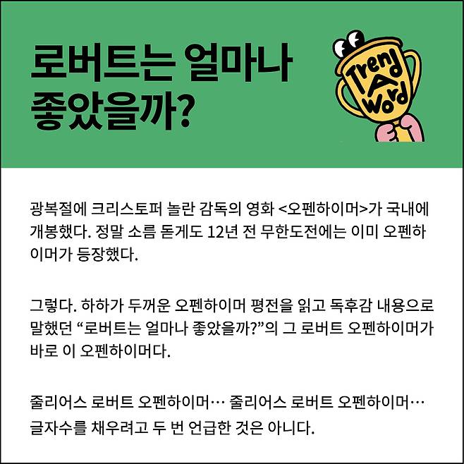 오늘은 광복절에 개봉한 따끈따끈한 영화 <오펜하이머>와 관련된 밈을 가지고 왔다. 로버트는 얼마나 좋았을까? 이렇게 한국인들의 밈이 되다니.