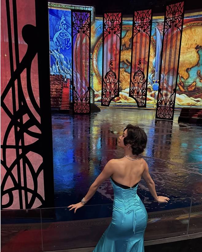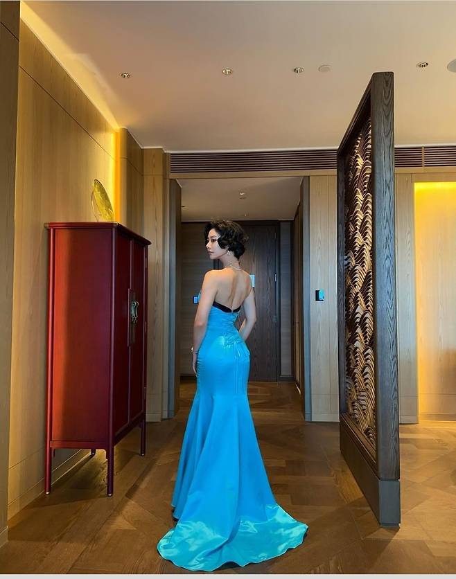 클라라는 물결처럼 찰랑이는 실키한 텍스처의 파란 머메이드 드레스를 착용한 모습으로 등장해 시선을 집중시켰습니다.