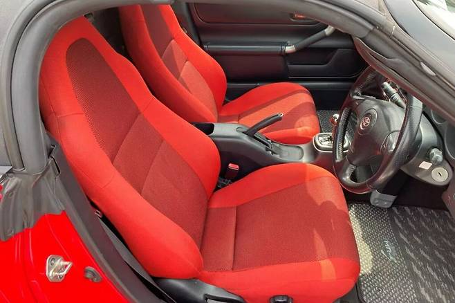 실내는 크게 바뀌지 않았다. 내비게이션 디스플레이 외에는 MR2 원형 구성 그대로를 유지하고 있으며, 붉은색 버킷 시트와 스티어링 휠, 대시보드도 원형 그대로다. 외장은 페라리 전용 색상인 로쏘 코르사로 도색됐고, 18인치 워크 알로이 휠이 장착됐다. 다만 일부 범퍼 하단 스크래치, 보닛 끝부분의 페인트 크랙, 루프 내장 손상 등 세월의 흐름이 엿보이는 것은 감성으로 받아들이자.