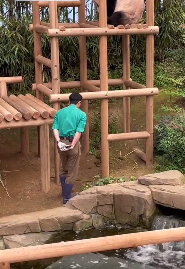 러바오가 헛구역질을 하자 이를 지켜보던 송바오 송영관 주키퍼도 방사장에 들어와 가까이에서 아이의 상태를 살폈는데요. 러바오는 몇 초 간 구토를 하면서 고구마 생산도 동시에 하는 모습이었죠.