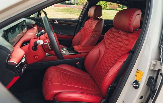 뿐만 아니라, 실내 곳곳에는 스포츠 패키지 전용 카본 가니시가 적용되어 고급스러움과 스포티함을 동시에 극대화합니다. 실제 카본 소재의 질감과 패턴은 실내 분위기를 한층 더 역동적으로 만들며, 차량의 전체적인 완성도를 비약적으로 끌어올립니다. 이러한 디테일은 운전자가 차량에 탑승하는 순간부터 특별함을 느끼게 하는 중요한 요소입니다. 시트 역시 특별합니다. 측면 지지력이 강화된 스포츠 시트는 단순히 멋을 위한 것이 아니라, 고속 코너링이나 급격한 차선 변경 시 운전자의 몸을 안정감 있게 지지해 주어 최상의 착좌감과 안정성을 동시에 제공합니다. 장거리 운전 시에도 피로감을 최소화하며, 운전자가 차량과 한 몸이 된 듯한 일체감을 느끼게 합니다. 이처럼 G80 스포츠 패키지의 실내 인테리어는 외관적 미학은 물론, 운전자의 편의와 주행 안정성이라는 기능적인 부분까지 모든 면에서 완벽에 가까운 조화를 이루고 있습니다.