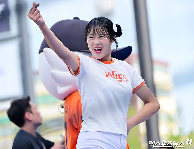 (엑스포츠뉴스 대전, 김한준 기자) 18일 오후 대전 한화생명 볼파크에서 열린 '2025 신한 SOL Bank KBO리그' SSG 랜더스와 한화 이글스의 경기, 이호은 치어리더가 열띤 응원을 선보이고 있다.