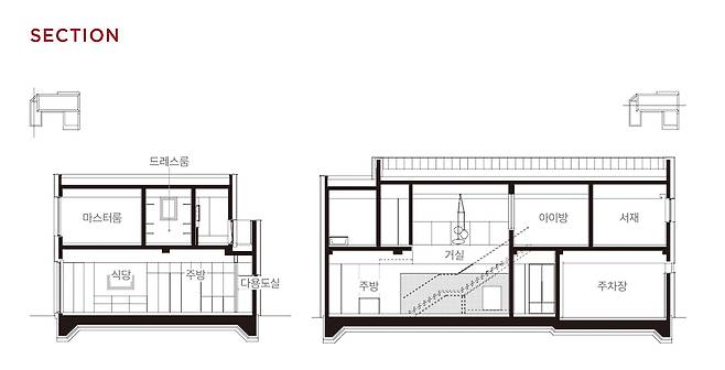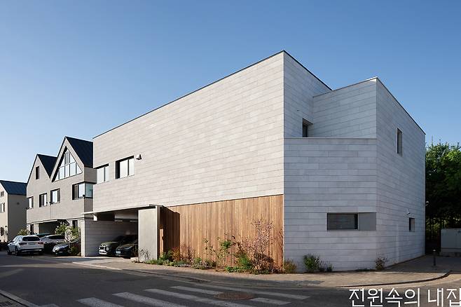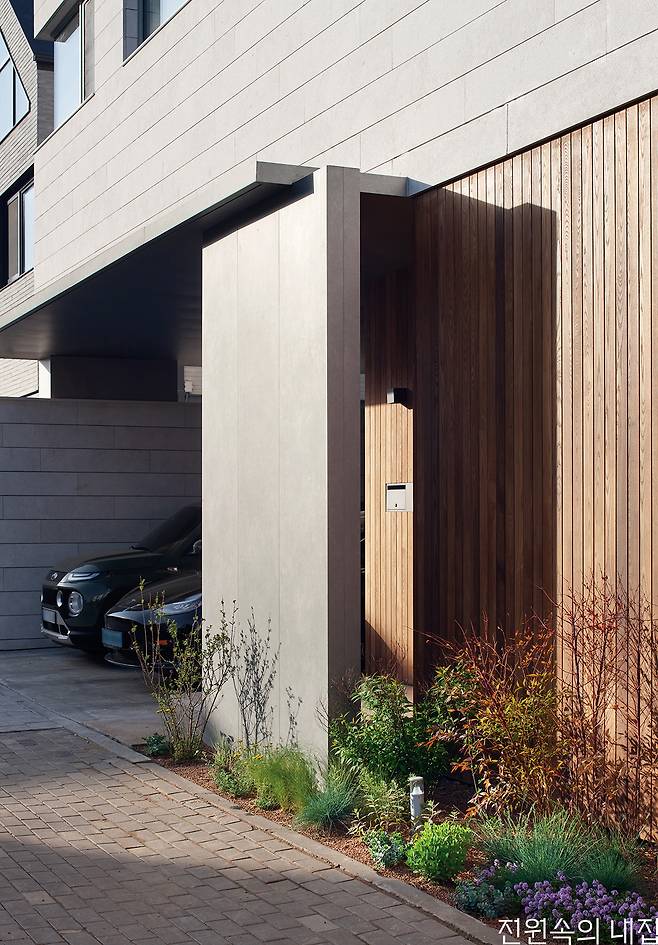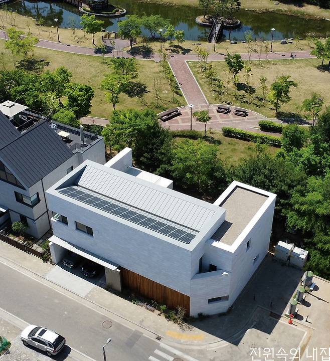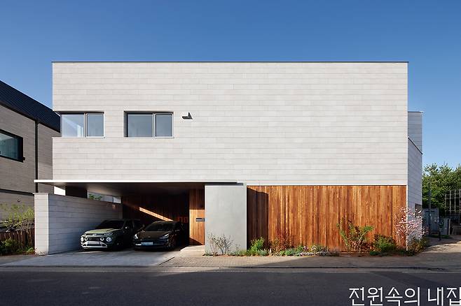 부부는 타운하우스 거주 경험을 바탕으로 원하는 바가 명확했다. 건축가에게 공원으로의 조망과 주변으로부터의 차폐, 필로티 주차, 오픈 천장 등을 갖춘 집을 설계해주기를 요청했다. 이한건축사사무소의 이호석, 한보영 소장은 남쪽 공원으로는 적극적인 자세를 취하되, 도로나 이웃 주택으로부터는 독립되면서도 유난스럽지 않고 차분한 형태로 주변과 어우러지는 집을 설계하고자 했다.