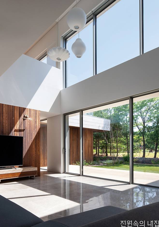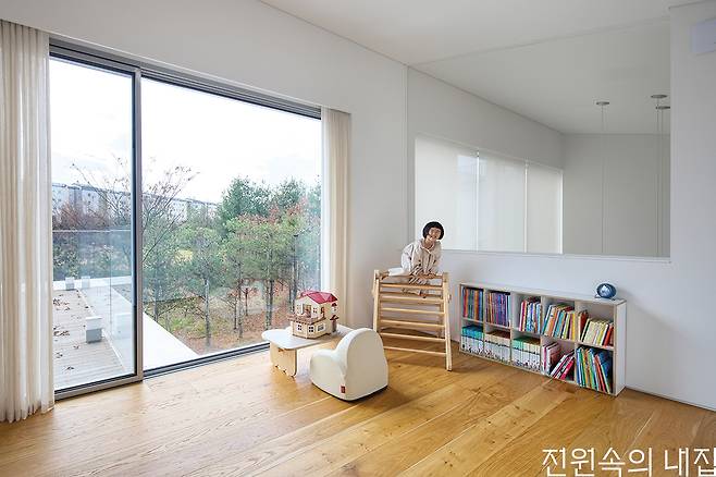 2층에는 마스터룸, 아이방, 서재를 배치했다. ㄷ자의 서쪽에 해당하는 2층 마스터룸은 중정을 바라볼 수 있도록 배치해 인접지의 시선을 막고 강한 서향 빛을 걸러 준다. ㄷ자의 동쪽은 비워서 테라스를 만들었다. 따뜻한 남동향의 빛을 깊숙이 끌어들이고 2층 공간에서 공원을 향한 조망을 확보하고자 함이었다. 아이방에서는 거실과 주방을 내려다볼 수 있도록 통유리를 시공해 가족 간 소통에 도움을 준다. 집의 중심에 위치한 거실은 오픈 천장을 적용해 공원의 풍경을 적극적으로 끌어들였다.