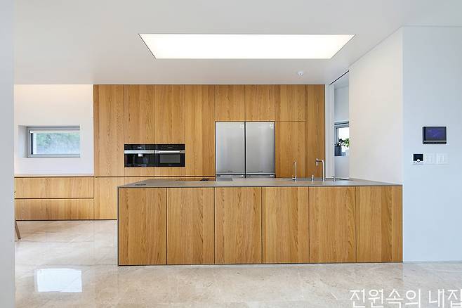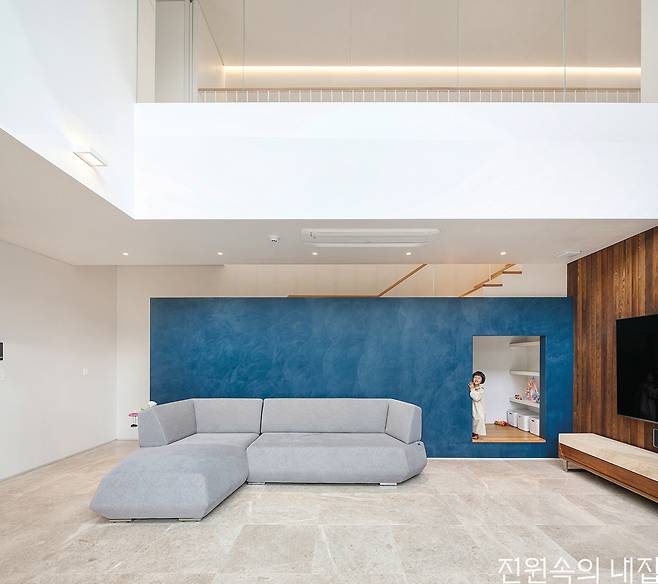 이로써 거실과 주방은 중정을 통해 쏟아지는 빛으로 충만하다. 주방은 거실과 다이닝 공간 사이에 위치시켜 가족들 간의 시선이 늘 닿을 수 있도록 했다. 거실 뒤편에 위치한 계단실 하부 공간은 아이의 동굴 같은 아지트 역할을 할 수 있도록 조성했다. 계단 난간 옆으로 벽체를 세워 아이에게 또 하나의 놀이방이 만들어졌다. 부부는 거실과 주방을 분주히 오가며 볼일을 보면서도 이 공간을 활용해 아이와 틈틈이 시간을 보낼 수 있게 되었다. 벽체는 톤다운된 블루 컬러로 마감해 화이트&우드 톤의 실내에 포인트가 되며, 계단 난간 틈새를 막아 아이들이 있는 집인 만큼 안전을 꾀할 수도 있었다.