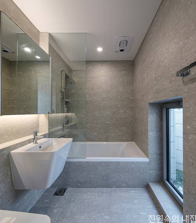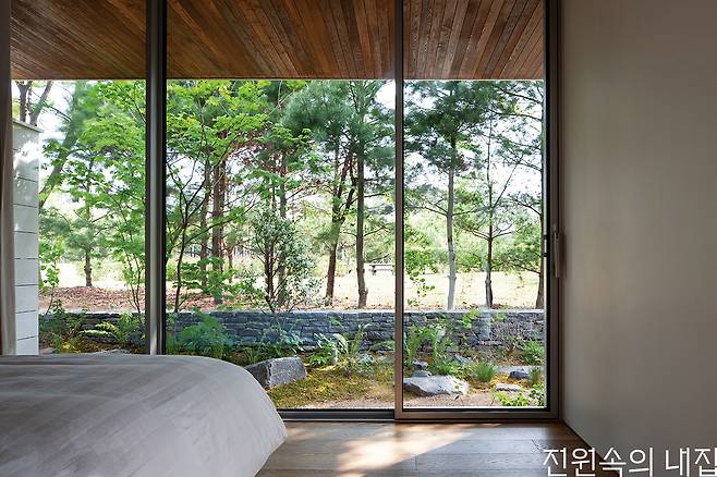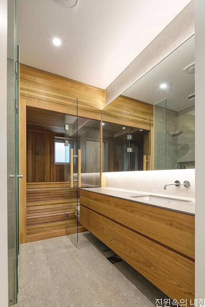 이제 막 백일을 지난 아기에게 자장가를 불러주며 숲속 리조트에 놀러 온 듯 명상의 시간을 보내기에 적합한 가족실은 계절감을 여실히 느낄 수 있는 공간이다. 가끔 집에 손님이 오면 가족실로 안내해 머물다 가게끔 게스트룸으로도 사용 중이다. 가족실 옆 사우나도 아이들과 함께 목욕 놀이를 하거나 육아에 쌓인 피로를 푸는 기능을 톡톡히 하고 있다.