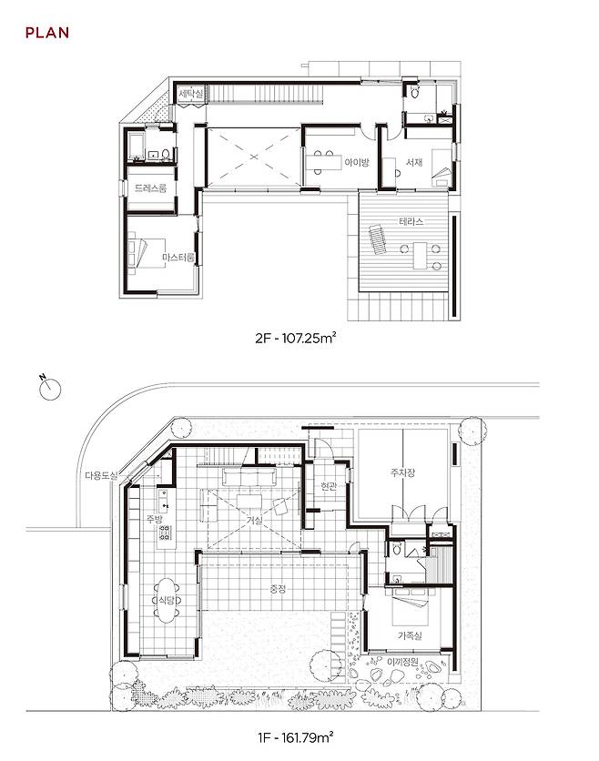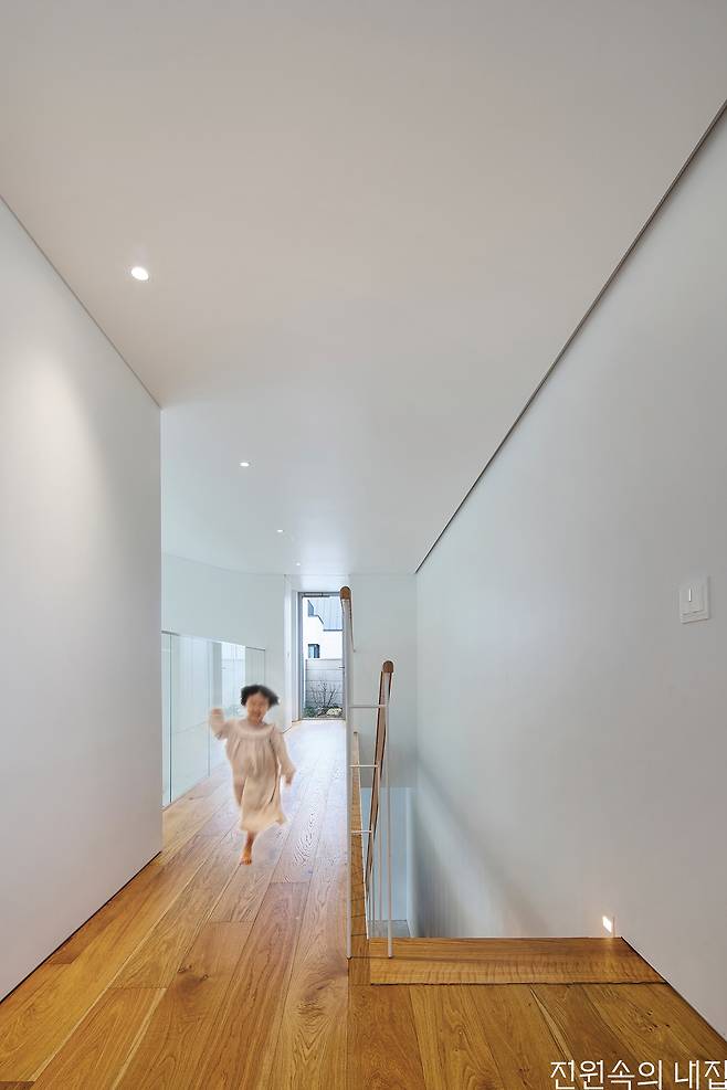 집은 공원으로 열린 ㄷ자 형태이다. 1층은 중정을 중심으로 거실과 주방을 배치했고 한쪽으로는 가족실을 두었다. 가족실은 건축주 부부에게 특별한 의미가 부여된 공간이다. 부부는 둘째 출산을 앞두고 아이의 유아기를 함께 보낼 공간을 상상했다. 상상에 구체적 계획을 더해 한옥의 별채처럼 숨은 복도를 지나 처마가 길게 뻗은 공간을 계획했다. 깊은 처마 아래로 이끼 정원이 자리 잡아 아늑하고 고요한 분위기를 만들어 낸다.