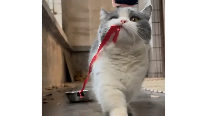 그런데 작은 고양이는 조금도 망설이지 않고 그 끈을 물더니, 밥그릇을 질질 끌고 집안을 돌아다니기 시작했습니다. 그 걸음걸이는 마치 잘 훈련받은 작은 병사처럼 늠름하고 자신감 넘치는 모습이었습니다.