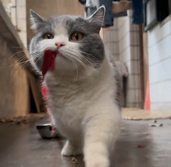 밥그릇을 끌고 집안을 유유히 돌아다니는 이 작은 고양이의 모습은 한 끼 식사를 위해 정말이지 필사적이었습니다.