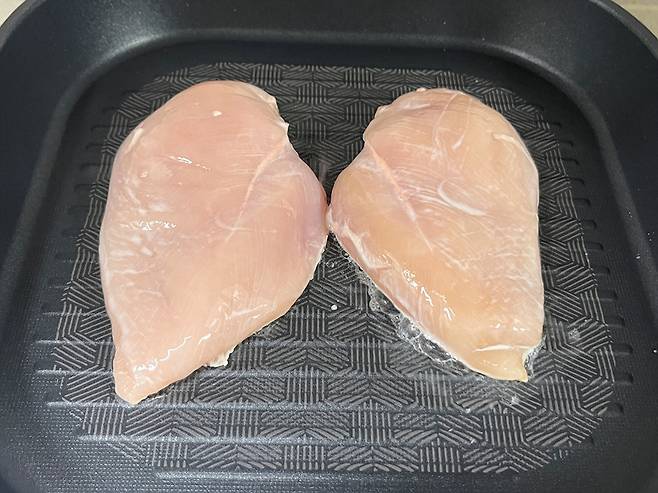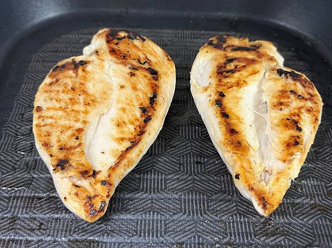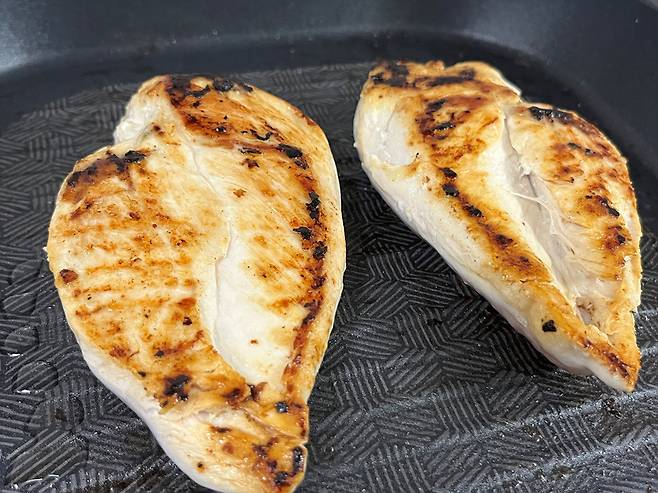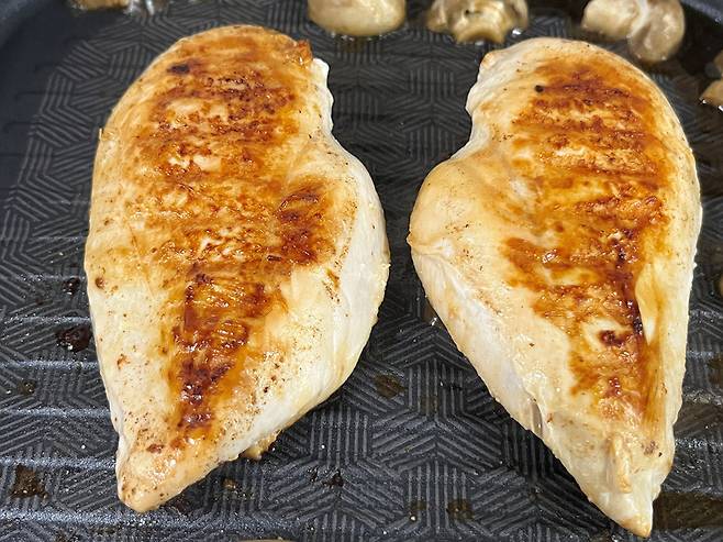 한쪽 면을 3분 정도 익힌 후 뒤집어서 반대쪽 면도 약 3분 익힙니다. 닭가슴살은 오래 구우면 수분이 다 빠져나가고 퍽퍽하기 때문에 시간에 주의하세요.