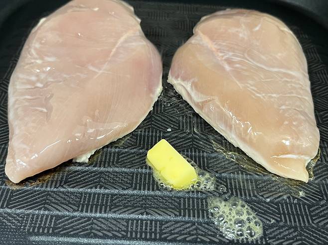 닭가슴살 자체가 감칠맛이 적기 때문에 버터를 추가하여 풍미를 입혀 주세요. 기호에 따라 소금, 후추 간도 해주면 좋습니다.