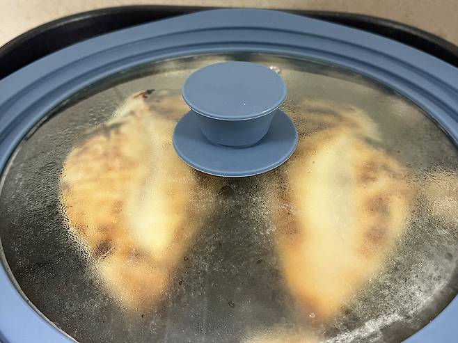 앞뒤로 3분씩 구운 후 불을 끄세요. 그리고 물을 소량 팬에 부어 주세요.